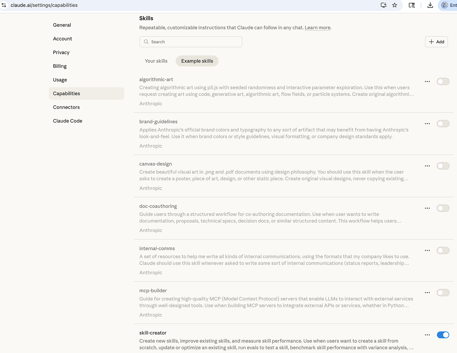 https://claude.ai/settings/capabilitiesYou will see what Skills are available for you. Claude has a set of pre configured skills that you can enable with the toggle. The only one that is toggled on by default is the skill-creator, that allows you to create a skill within the chat interface.
