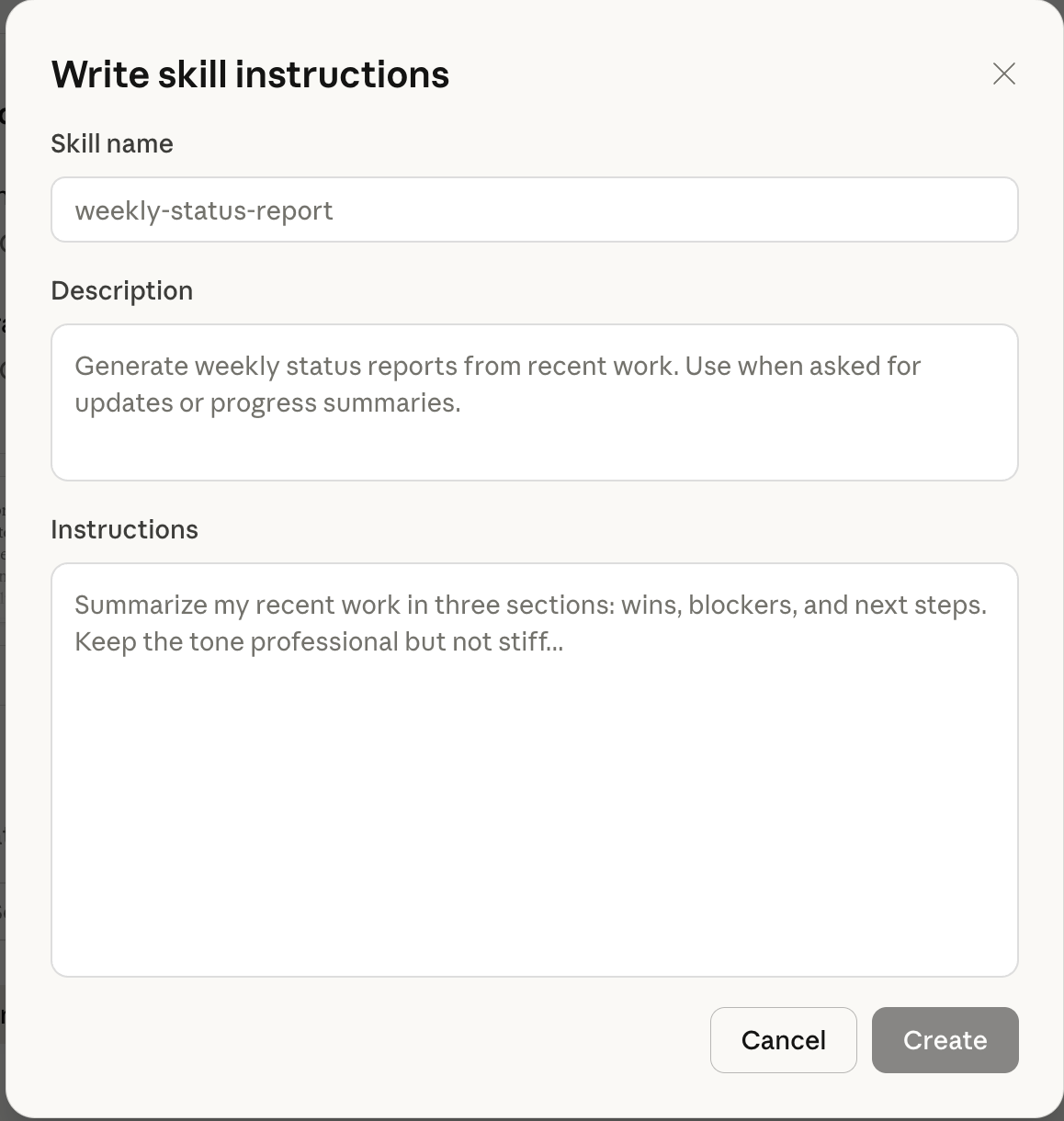 The key difference from simply pasting instructions into every conversation is persistence and context awareness. Skills become part of Claude’s working knowledge for your workspace. They’re always available, always consistent, and they evolve as you refine them over time.